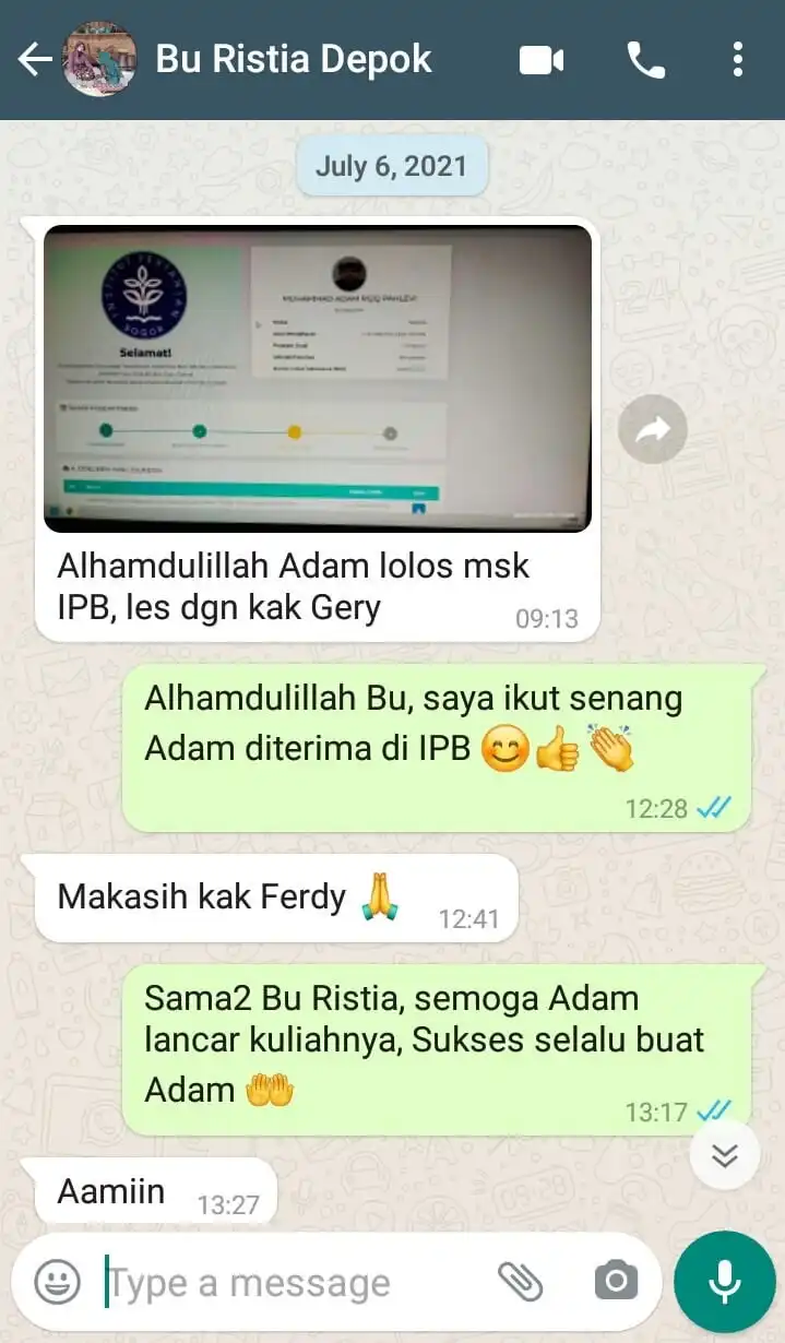 Adam les di IndoPrivat sejak kelas 12 SMA. Alhamdulillah tahun ini diterima di IPB Program Studi Silvikultur Fakultas Kehutanan.