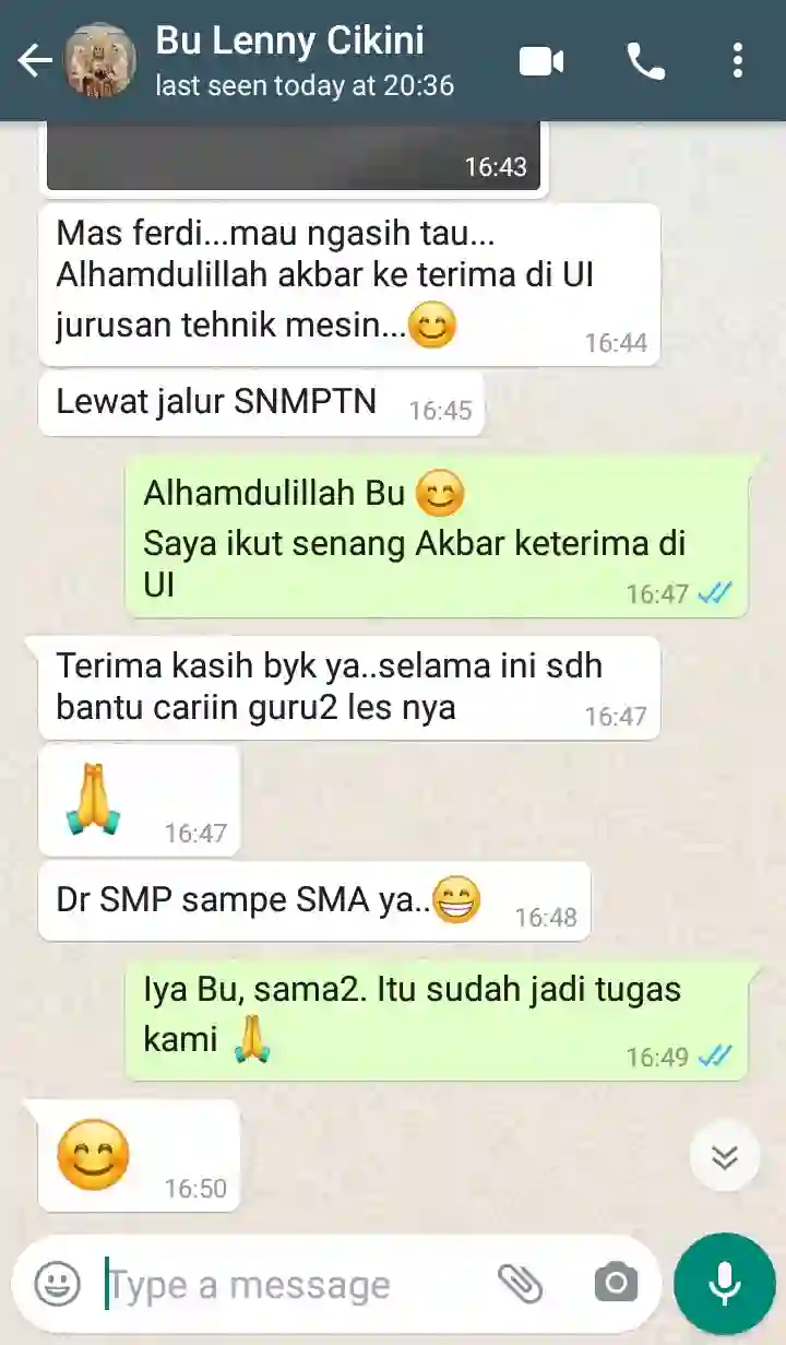 Akbar les di IndoPrivat sejak kelas 9 SMP sampai kelas 12 SMA. Alhamdulillah tahun ini diterima di UI jurusan Teknik Mesin melalui jalur SNMPTN yaitu jalur masuk tanpa tes.