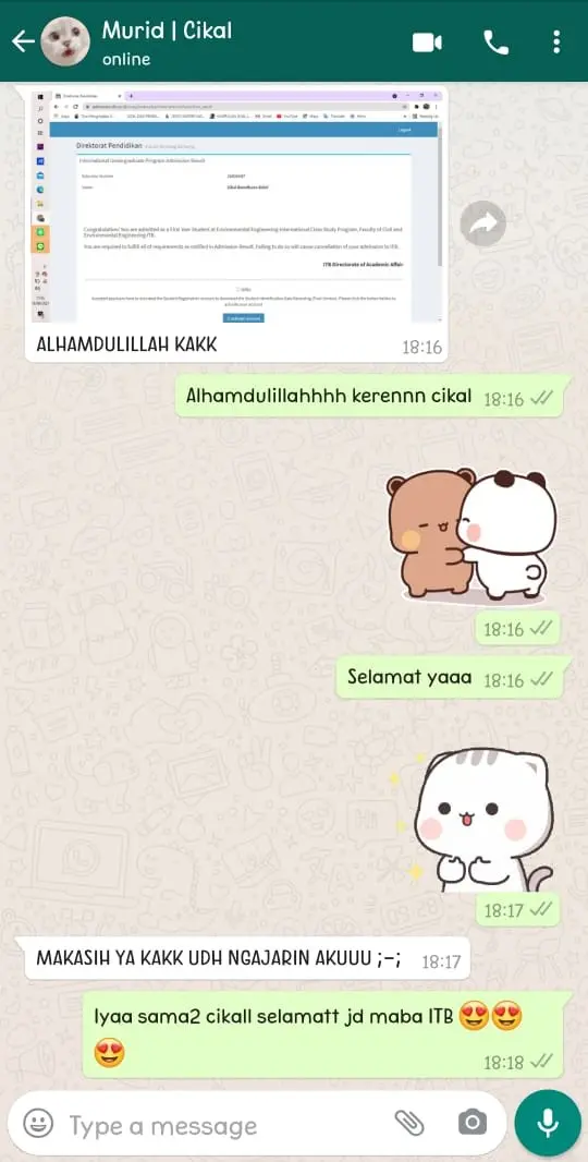 Cikal les di IndoPrivat sejak kelas 10 sampai kelas 12 SMA. Alhamdulillah tahun ini diterima di ITB jurusan Teknik Lingkungan.