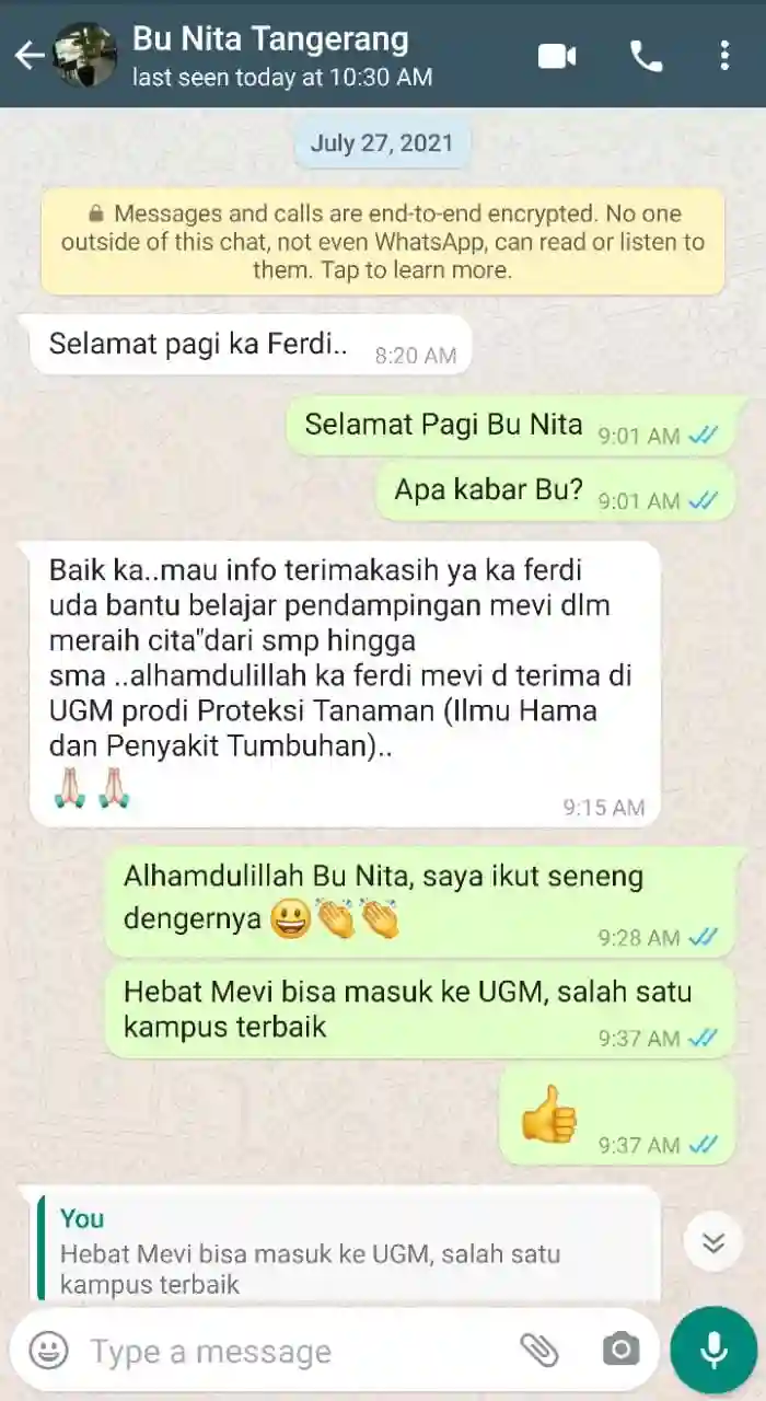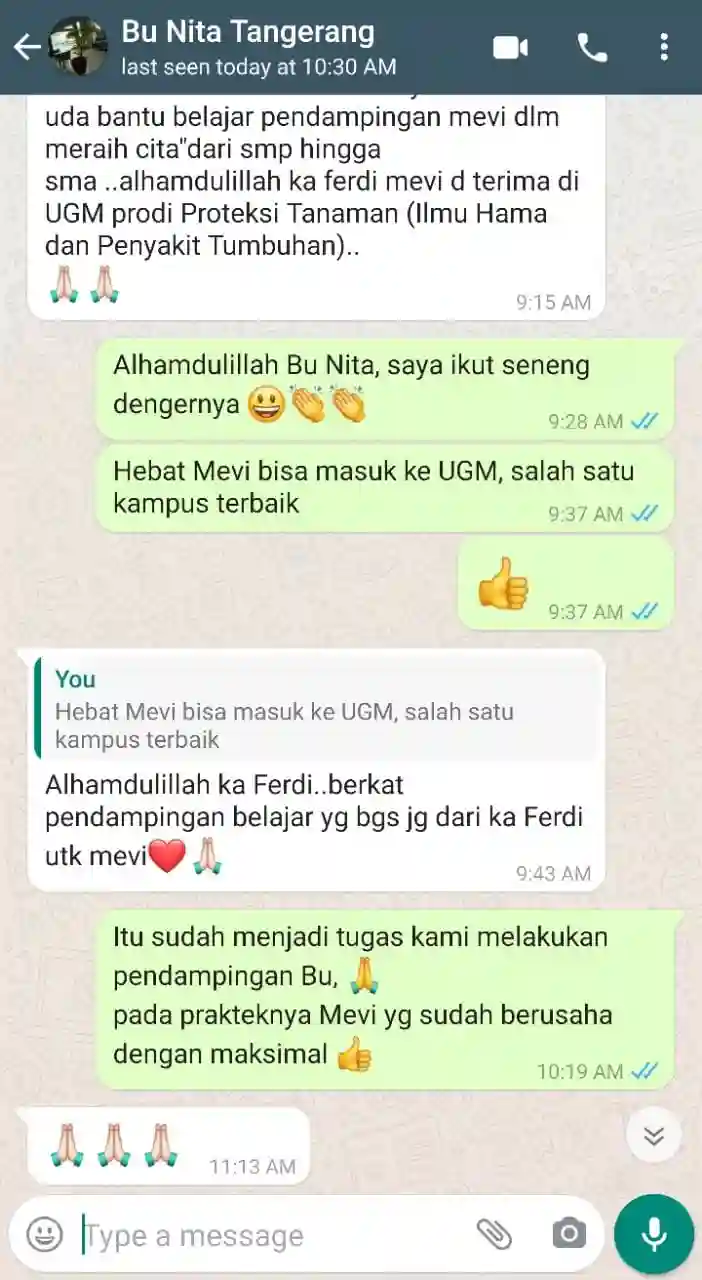 Mevi les di IndoPrivat sejak kelas 9 SMP sampai kelas 11 SMA. Alhamdulillah tahun ini diterima di UGM Program Studi Proteksi Tanaman.